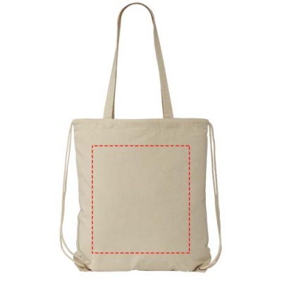 Многофункциональный хлопчатобумажный мешок с длинными ручками и затягивающим шнурком, который можно носить в качестве сумки для покупок или рюкзака. Большой основной отсек, закрывающийся затяжкой шнурка. Имеет две выпадающие ручки длиной 31 см. Вместимость: 1,5 л, выдерживает до 5 кг веса.