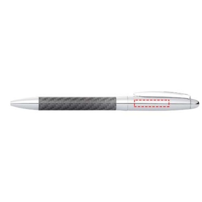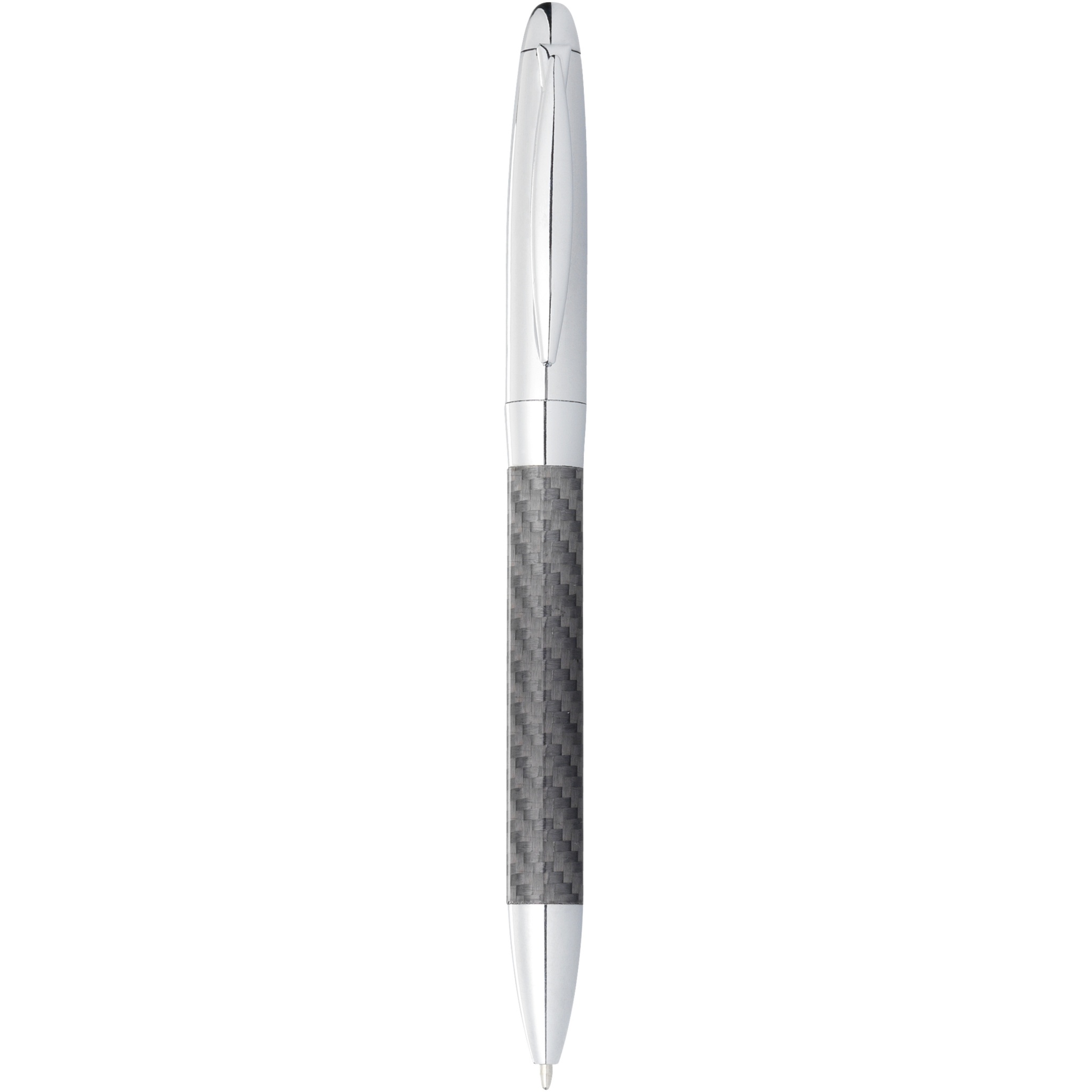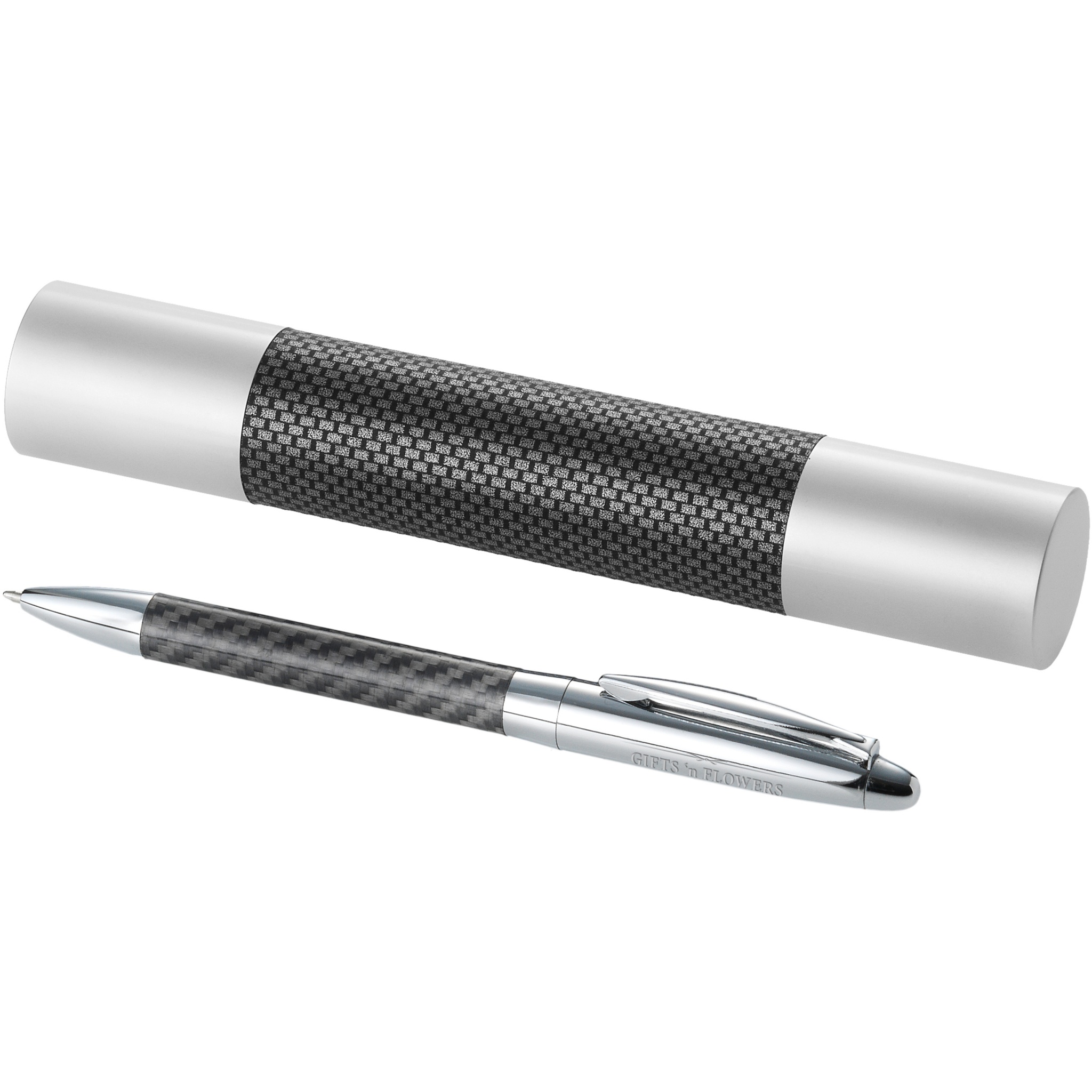 Классическая шариковая ручка с блестящей верхней частью и отделкой из углеродного волокна в нижней части. Включает цилиндрическую подарочную коробку.