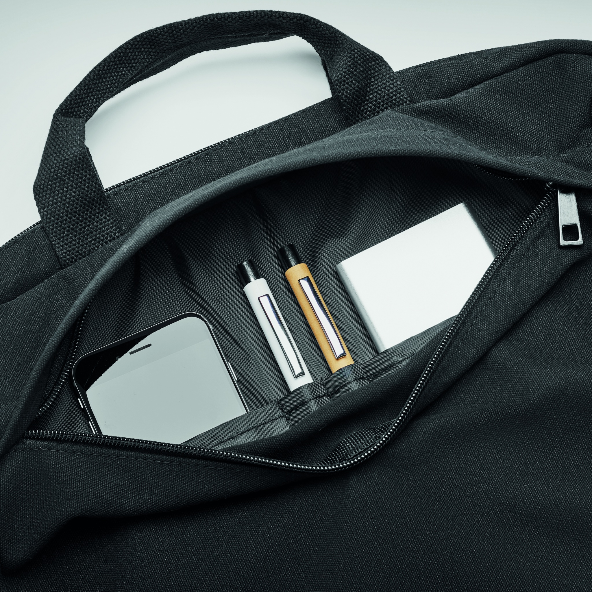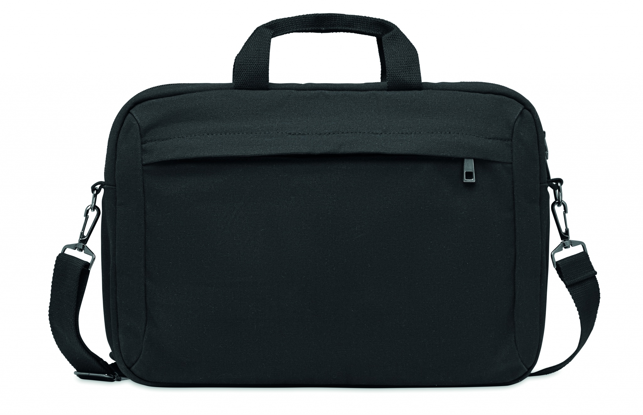 Компьютерная сумка из плотной парусины 340 гр/м². Съемный регулируемый плечевой ремень с мягкой подкладкой. Задний ремень для крепления на чемодане.