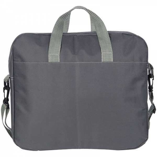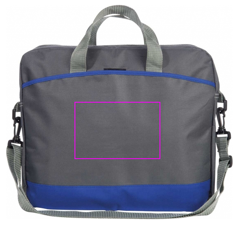 Серая сумка для ноутбука с яркими цветными акцентами, просторным внутренним отделением и передним отделением, на котором мы напечатаем ваш логотип.