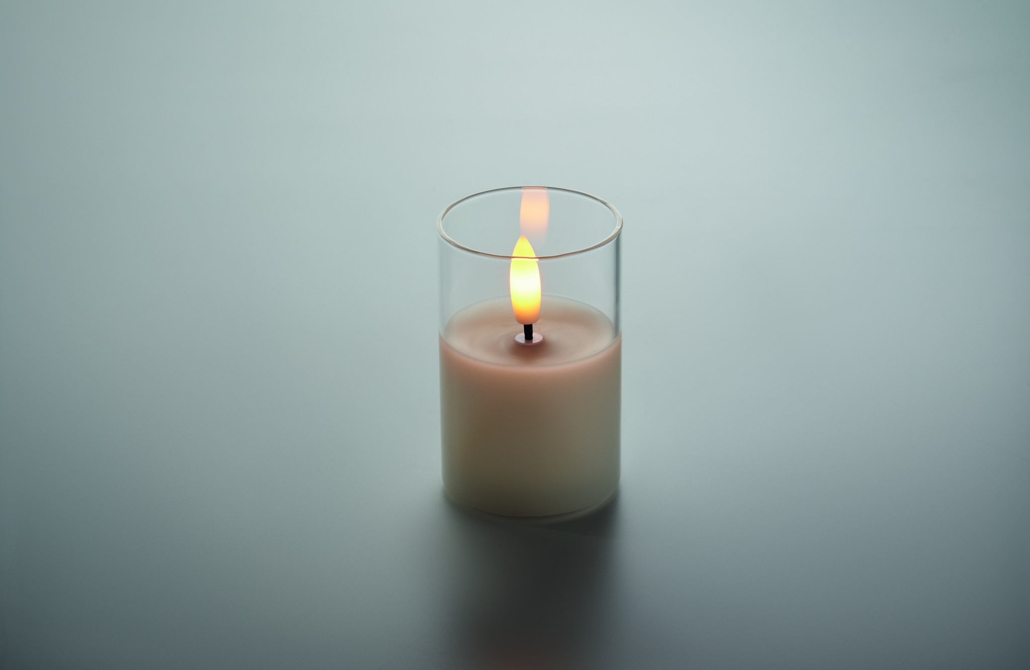 Небольшая светодиодная восковая свеча с эффектом реального пламени в стеклянном подсвечнике. В комплект входит батарейка CR2032.