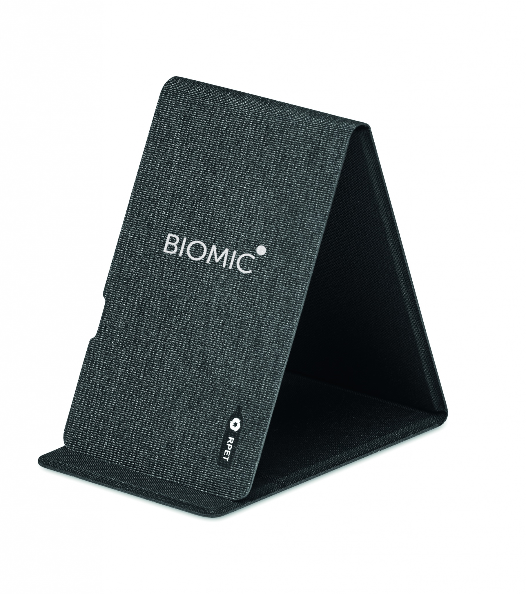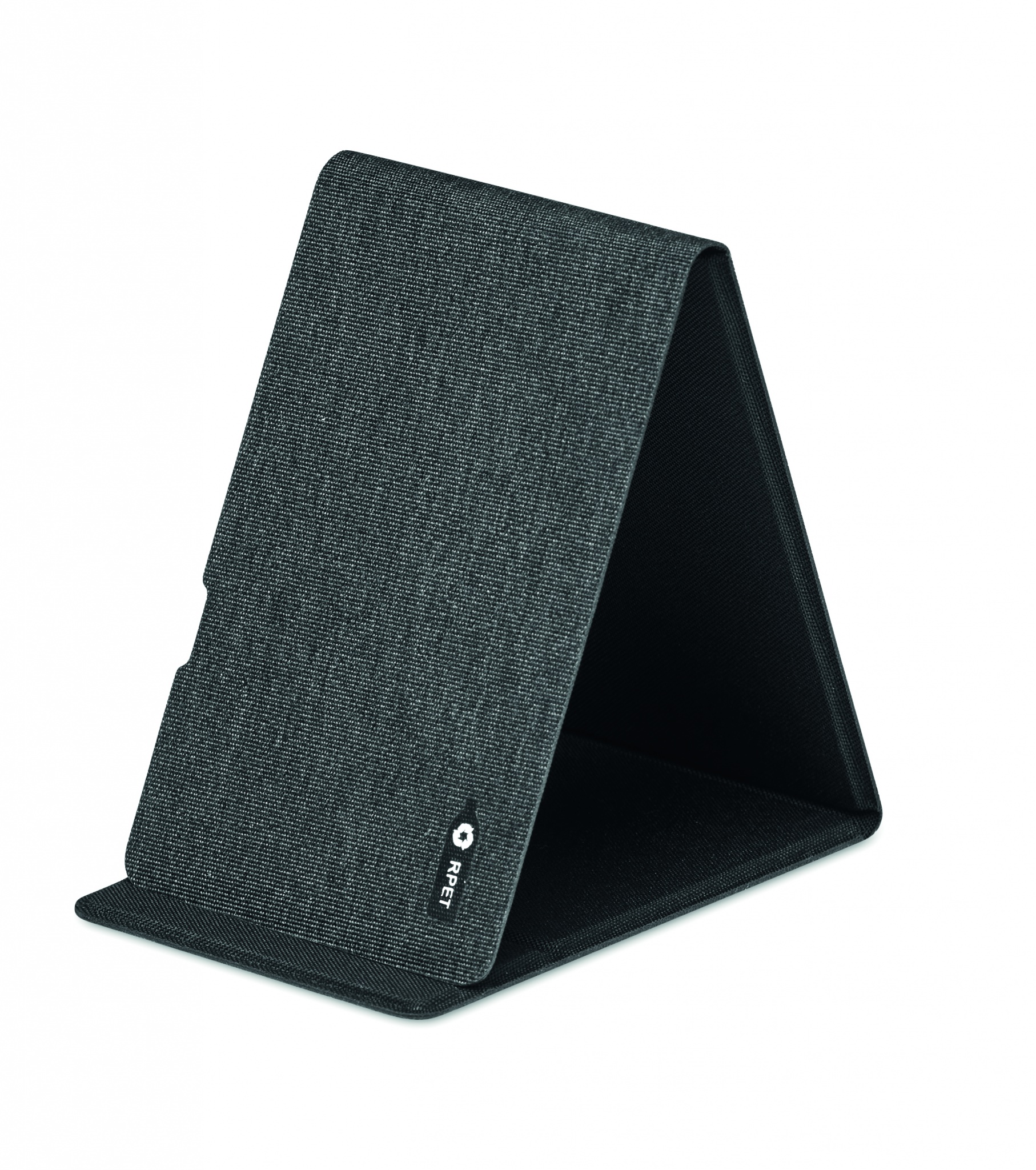 Подставка для телефона с беспроводной зарядкой на 15 Вт из RPET 300D. Выход: 9V/1.6A (15Вт) для быстрой зарядки. Совместима с последними моделями Androids, iPhone® 8 и новее.