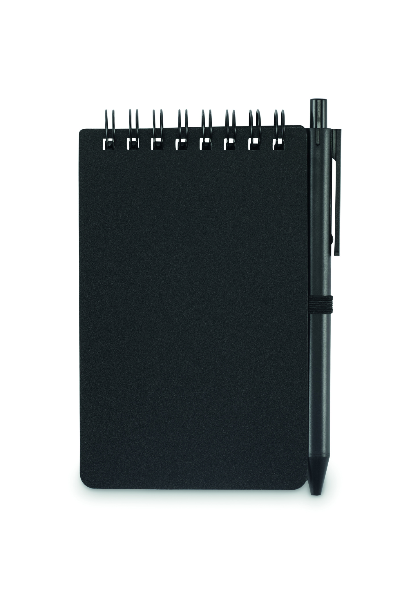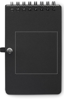 Water repellent notepad in PP cover with pen. Twin-wire. Mineral paper 120 gr/m², 50 sheets lined. Blue ink. Elastic closure strap and pen holder.