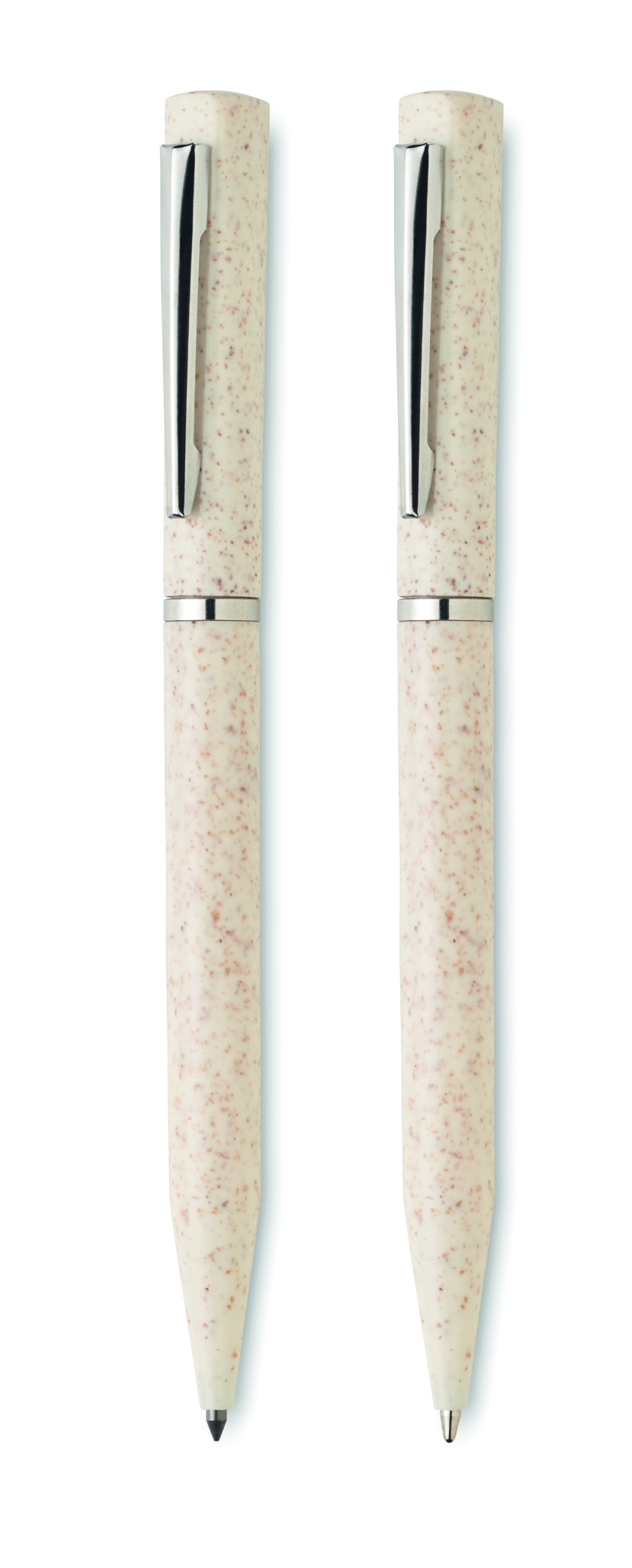 Wheat straw/ABS pen set with 1 twist ball pen blue ink and 1 twist graphite inkless ball pen. Presented in recycled paper box.