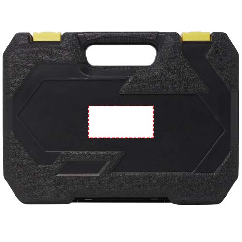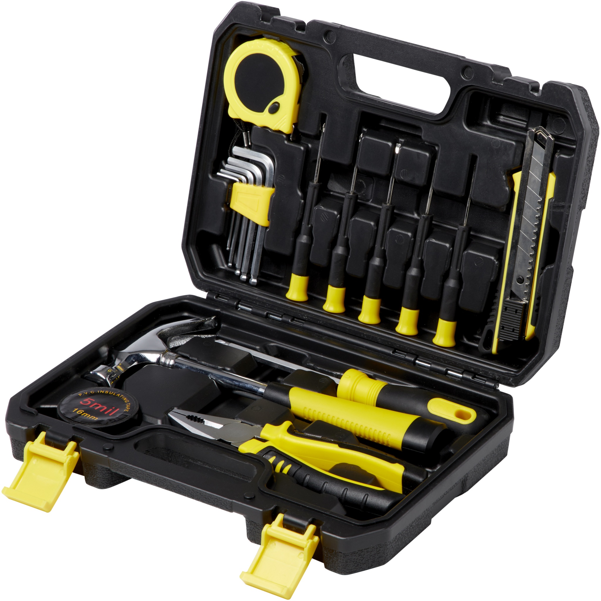 Инструментальный ящик с замком и складной ручкой, включающий молоток-гвоздодер, отвертку с плоским шлицем 4 мм, универсальные плоскогубцы, универсальный нож с фиксатором, 5 шестигранных ключей (2-6 мм) с держателем со стандартными и шаровыми наконечниками, измерительную рулетку длиной 3 м с фиксатором, индикаторную отвертку, изоляционную ленту и 4 прецизионных отвертки.