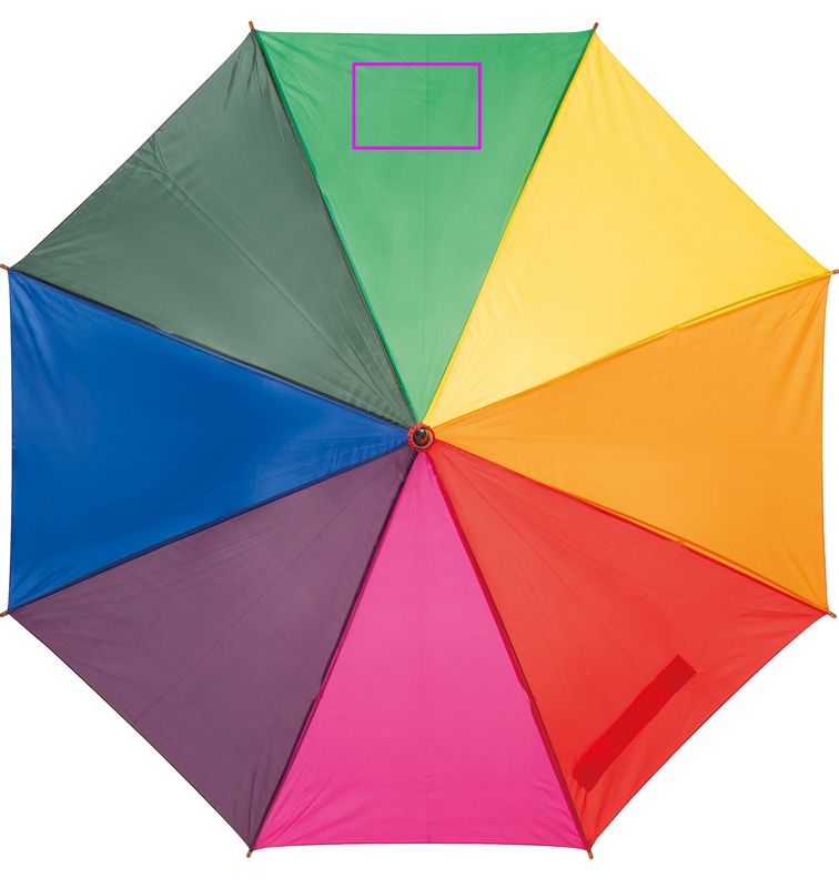 Привлекательный, многоцветный автоматический зонт с изогнутой деревянной ручкой. Мы печатаем ваш логотип на сегменте.