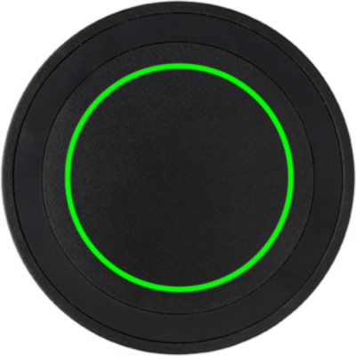 Trådlös laddare med silikonring som håller telefonen på plats. LED-lampan indikerar att enheten laddar. Kompatibel med alla QI-aktiverade enheter som senaste generationen Android, iPhone 8 och upp. Input: 5V/1,5A. Trådlös output: 5V/1A, 5W