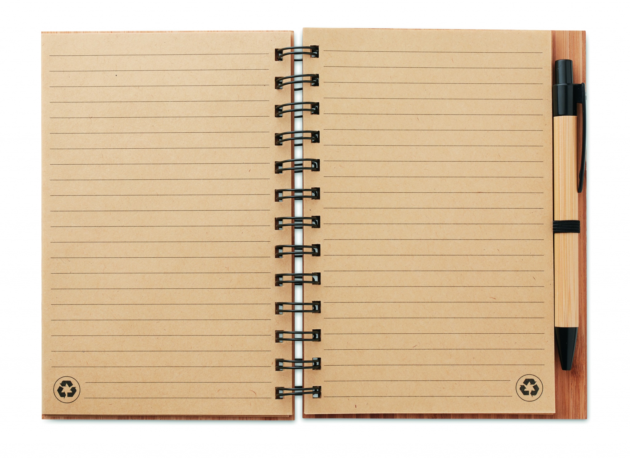 Anteckningsbok i Bambu med 70 sidor av återvunnet papper i inlagan. Matchande kulspetspenna i Bambu med detaljer i ABS plast ingår.