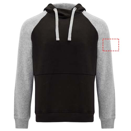 Tvåfärgad unisexhuvtröja. Huva med korsad hals och metallöglor. Kontrasterande innerhuva, dragsko och raglanärmar. Känguruficka. Muddar och fåll i ribbstickad 1 x 1 elastan. Avtagbar etikett.