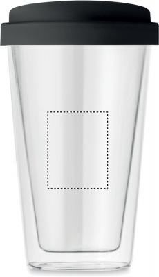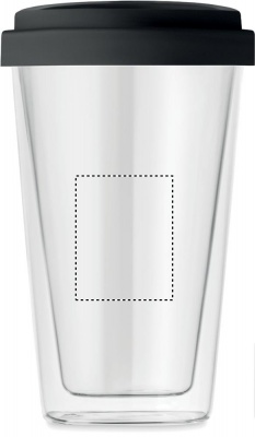 350ml Take away mugg i Borosilikat glas med dubbelvägg och silicon lock. Borosilikatglas är en typ av glas som inte kommer att spricka under extrema temperaturförändringar som vanligt glas. Tack vare detta har borosilikatglas förmågan att gå direkt från en frys till ugn och har därför gjort det till valet för avancerade restauranger, laboratorier m.m. För dig betyder det att du kan hälla varmt vatten, te eller kaffe utan att oroa dig. Tål maskindisk. Trycket på produkten är inte diskmaskinssäkert.