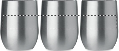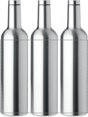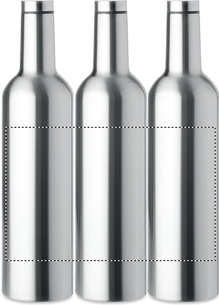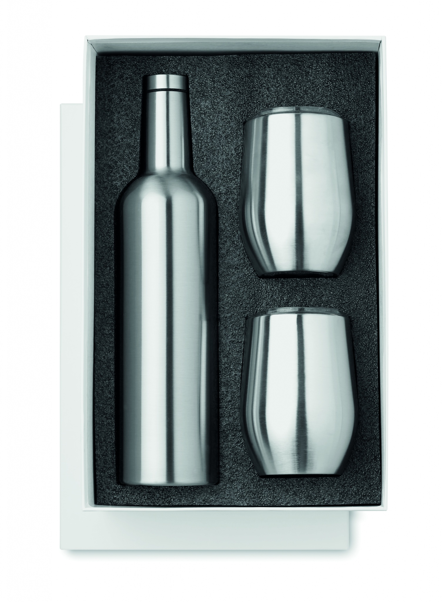 Set i rostfritt stål med dubbelvägg. Flaska med bambukork (750 ml kapacitet), 2st rostfria muggar dubbelvägg (350 ml kapacitet). Läckagefritt.