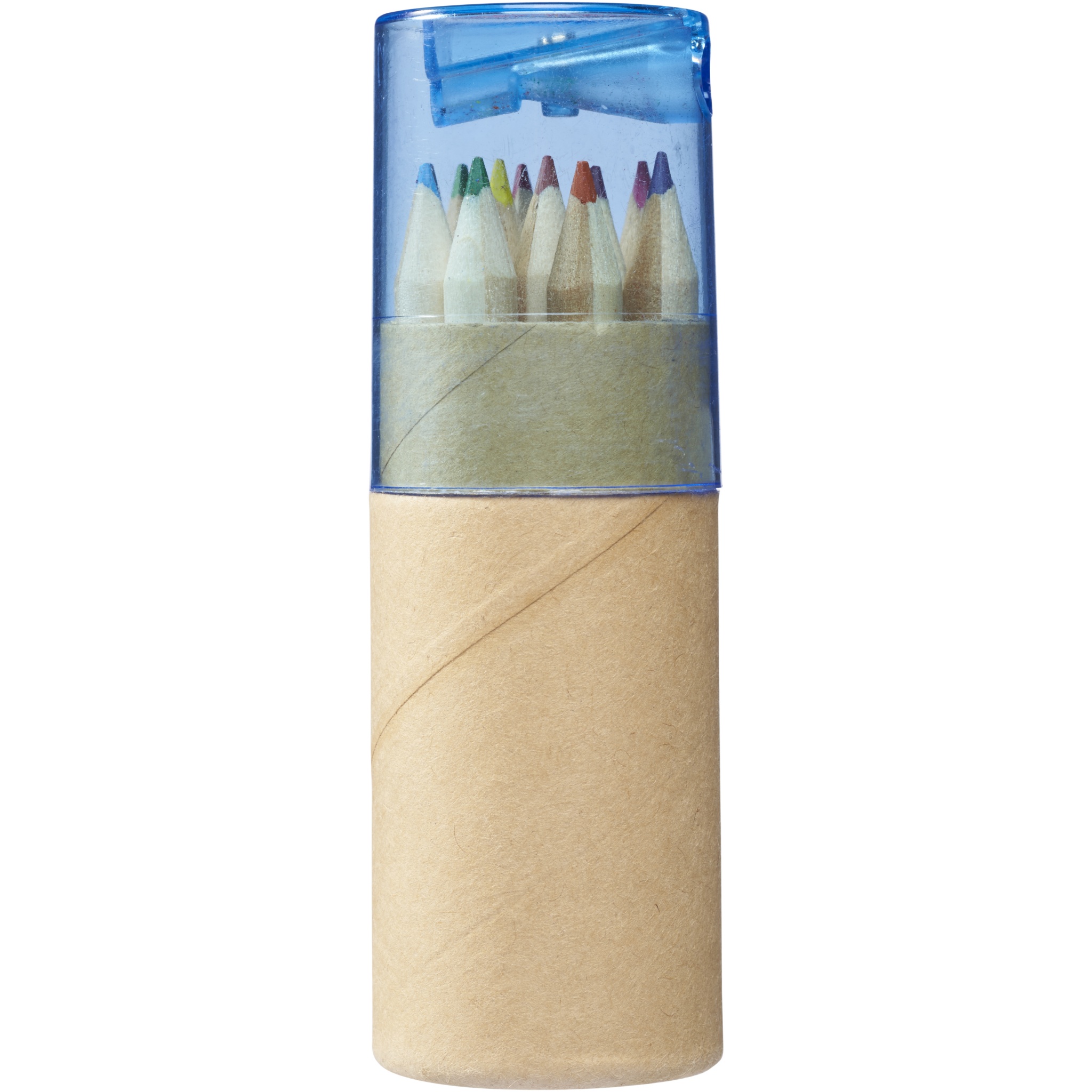12 färgpennor i en pappcylinder med pennvässare i plastlocket. Endast förpackning kan märkas.