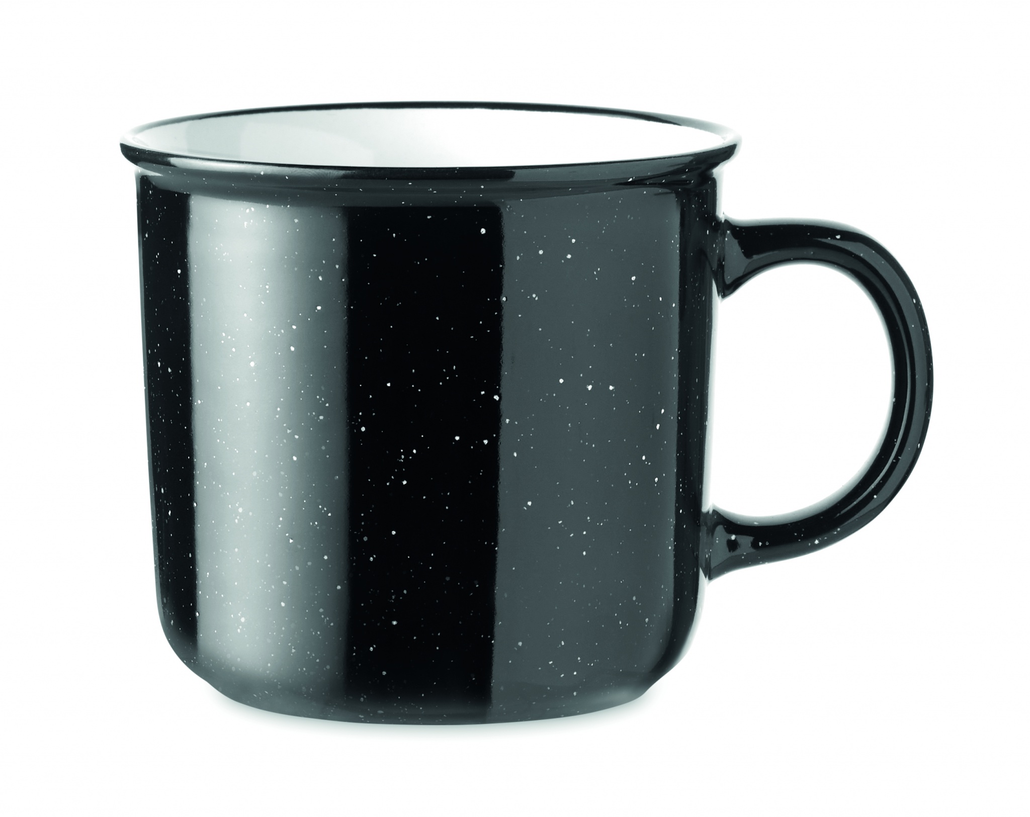 Stor mugg i keramik i vintagestil. På grund av det fläckiga mönstret kommer fläckar att vara synliga i den tryckta logotypen. Kapacitet: 400 ml.