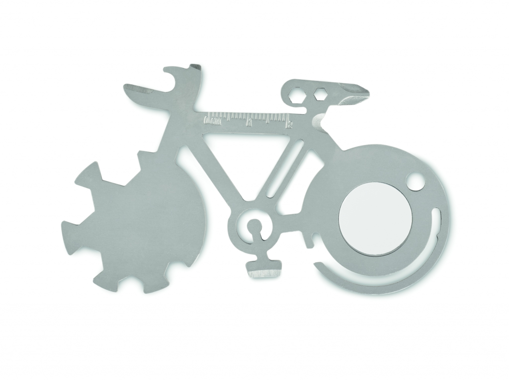 Multiverktyg 11-i-1 i rostfritt stål i cykelform. Från flasköppnare, kniv, linjal eller stjärn-skruvmejselverktyg.