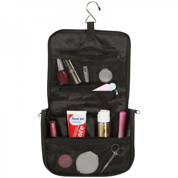 Toalettväska i 190T nylon med stort innerfack, 3 fack med blixtlås, 4 elastiska band och hängkrok. Vi trycker din logotyp på framsidan.