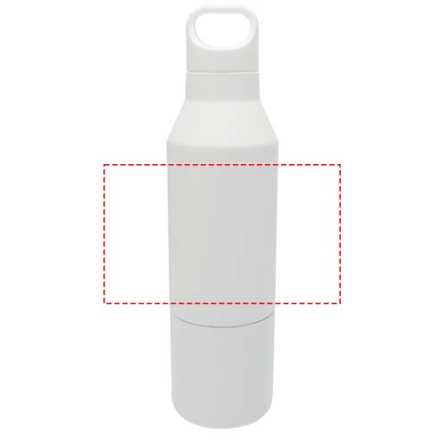 RCS-certifierad dubbelväggig kopparisolerad flaska i rostfritt stål med avtagbar mugg. Denna multifunktionsflaska är utformad för att passa i sidofickan på en ryggsäck och har ett praktiskt bärhandtag som är integrerat i locket. Slitstark ytbeläggning på utsidan. Håller drycker varma i 12 timmar och kalla i 24 timmar. Levereras i en presentförpackning av återvunnen kartong. Flaskans volymkapacitet: 600 ml. Koppens volymkapacitet: 300 ml.