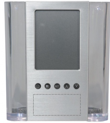 Exponera ditt budskap varje dag på skrivbordet. Pennhållare med kalender, alarmklocka och termometer. 1 cell batteri ingår.