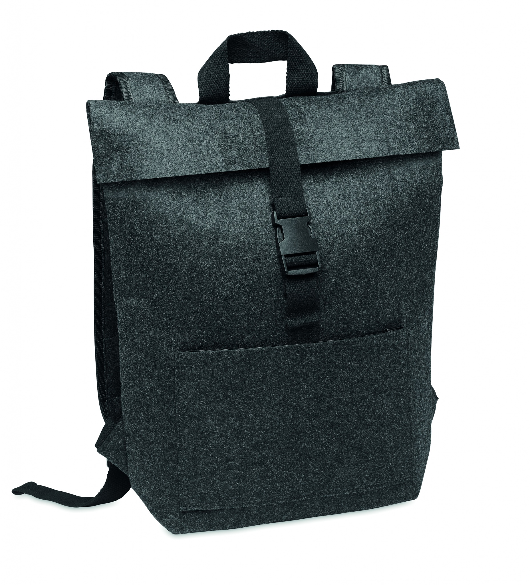 Ryggsäck av RPET-filt med bomullsrem och ficka med dragkedja på framsidan. Den har ett fack för bärbar dator.