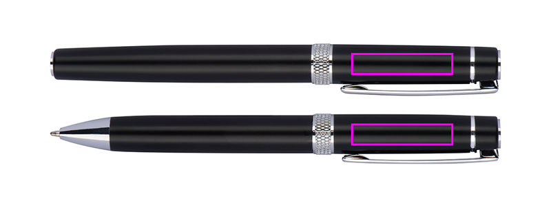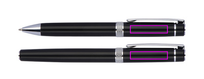 Skrivset bestående av en vriden kulspetspenna med blått skrivsystem refill och en blå skrivrulle av aluminium i ett fodral. Kromapplikationerna och de gnistrande dekorativa ringarna ger setet dess eleganta utseende. Din logotyp kommer att graveras på båda pennorna till höger om klämman.