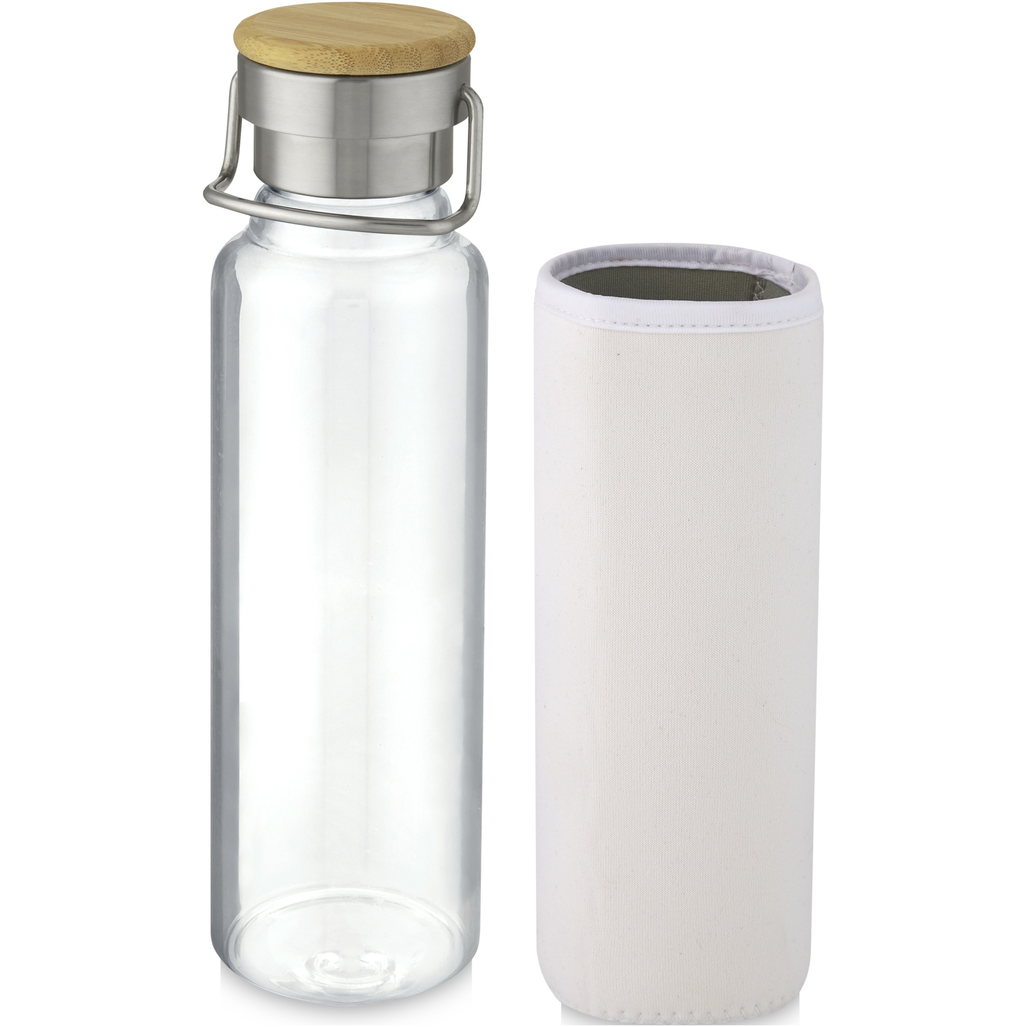 Borosilikatglasflaska med enkelvägg och skyddsfodral av neopren. Har ett skruvbart lock med bambutopp, samt ett handtag för att enkelt bära med sig. Flaskan är tillverkad av 100 % hållbart borosilikatglas som bevarar färskheten i drycken och innehåller inte några skadliga kemikalier. BPA-fri, testad och godkänd enligt tysk lagstiftning om livsmedelssäkerhet (LFGB). Testad och godkänd för ftalatinnehåll enligt REACH-förordningarna. Den bambu som används är från hållbara, miljömässigt och socialt ansvarsfulla källor. Volymkapacitet 660 ml. Genom att ta bort neoprenfodralet och locket tål flaskan maskindisk. Levereras i en återvunnen presentförpackning av kartong.