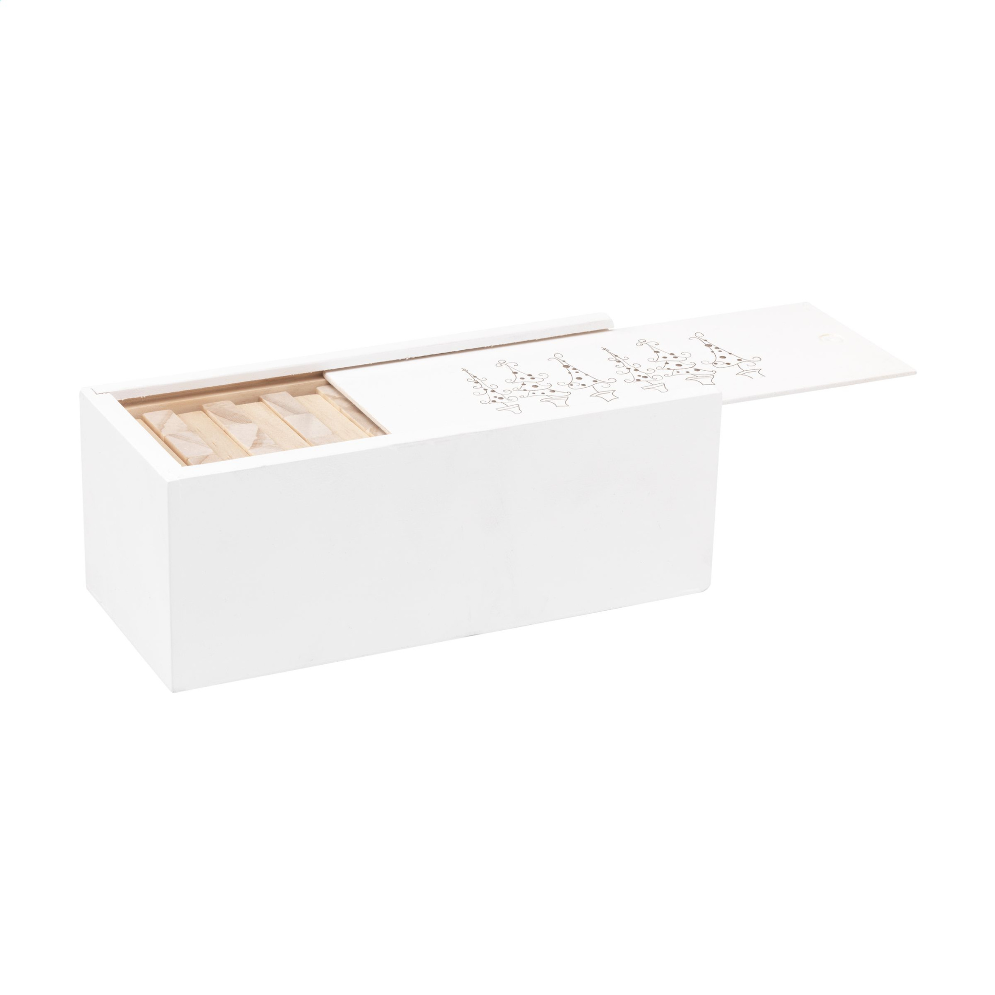 Trästapelspel (48 block) med standard juldesign. Tornmått 16,5 x 6 x 6 cm. Presenteras med en vit trälåda med skjutöppning för enkel förvaring. Inkl. instruktioner. - Den här produkten är tryckt med en vanlig juldesign. Val av 6 olika mönster som visas på bilderna. Det är inte möjligt att skräddarsy en design. Varje artikel levereras i en individuell brun kartong.