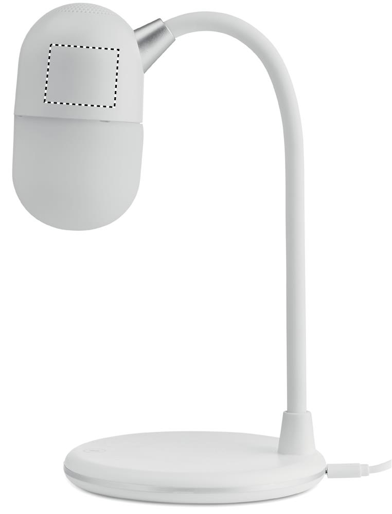 Bordslampa med trådlösladdning och trådlös högtalare. Lampan har tre olika ljusstyrkor, dagsljus, kallt ljus eller naturligt ljus. Den passar utmärkt till nattduks- eller skrivbordet och exponerar ditt budskap dagligen. Effekt DC5V/1A (5W).