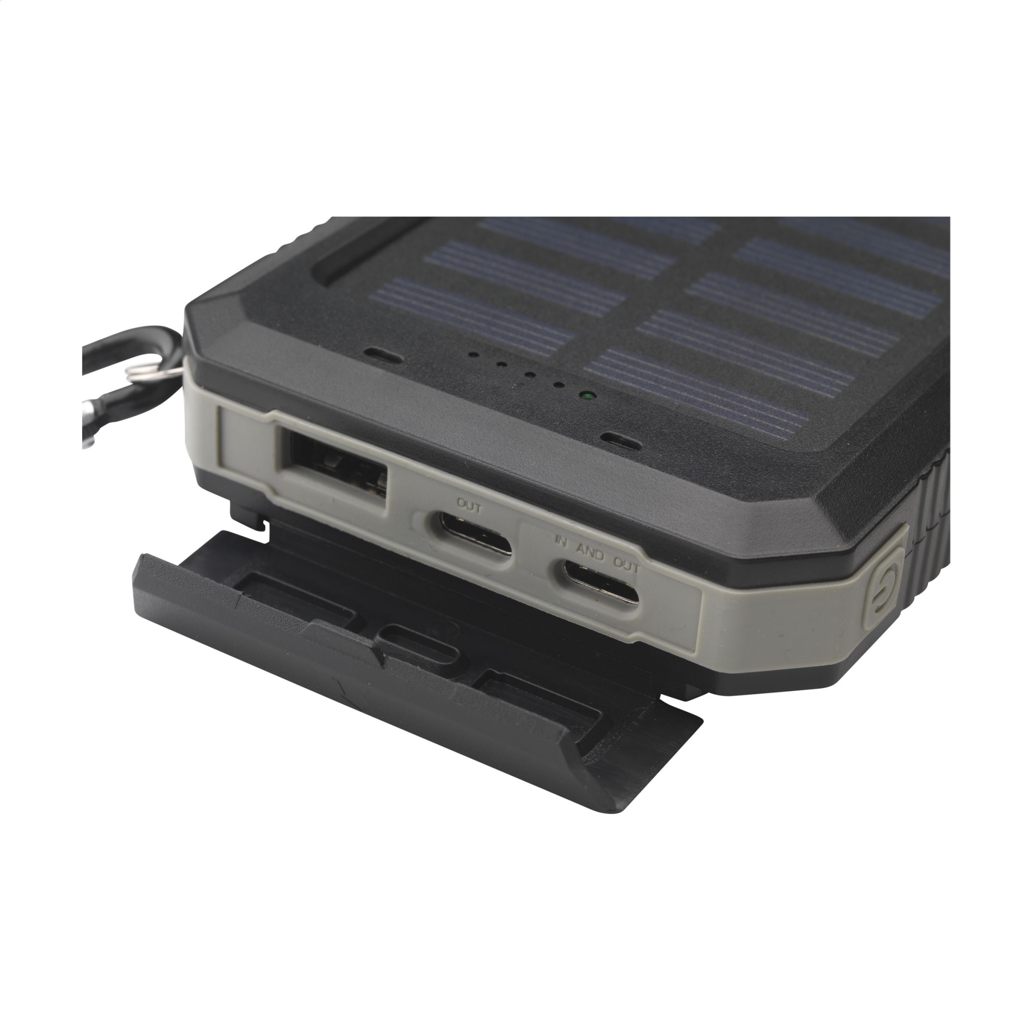 Stabil utomhus solenergi 8 000 mAh powerbank med ett hölje tillverkat av återvunnen ABS med skyddande silikonkanter i hörnen. Har en solpanel, integrerad kompass, LED-indikatorlampor, LED-ficklampa och karbinhake. Stänksäker och dammbeständig. Lämplig för att ladda de flesta vanliga smartphones och andra enheter. Ingång: Typ-C DC5V/2.1A. Utgång: Typ-C DC5V/2.1A. 1 x USB-A-port och 2 x USB-C-port. Solingång: 200 mAh. Laddningstid på solel ca 40 timmar. Kan laddas via elnätet eller solpanelen. Den idealiska, mångsidiga laddaren för utomhusaktiviteter. Inkluderar USB-C/USB-C laddningskabel och bruksanvisning. RCS-certifierad. Totalt återvunnet material: 17%. Varje artikel är individuellt förpackad.