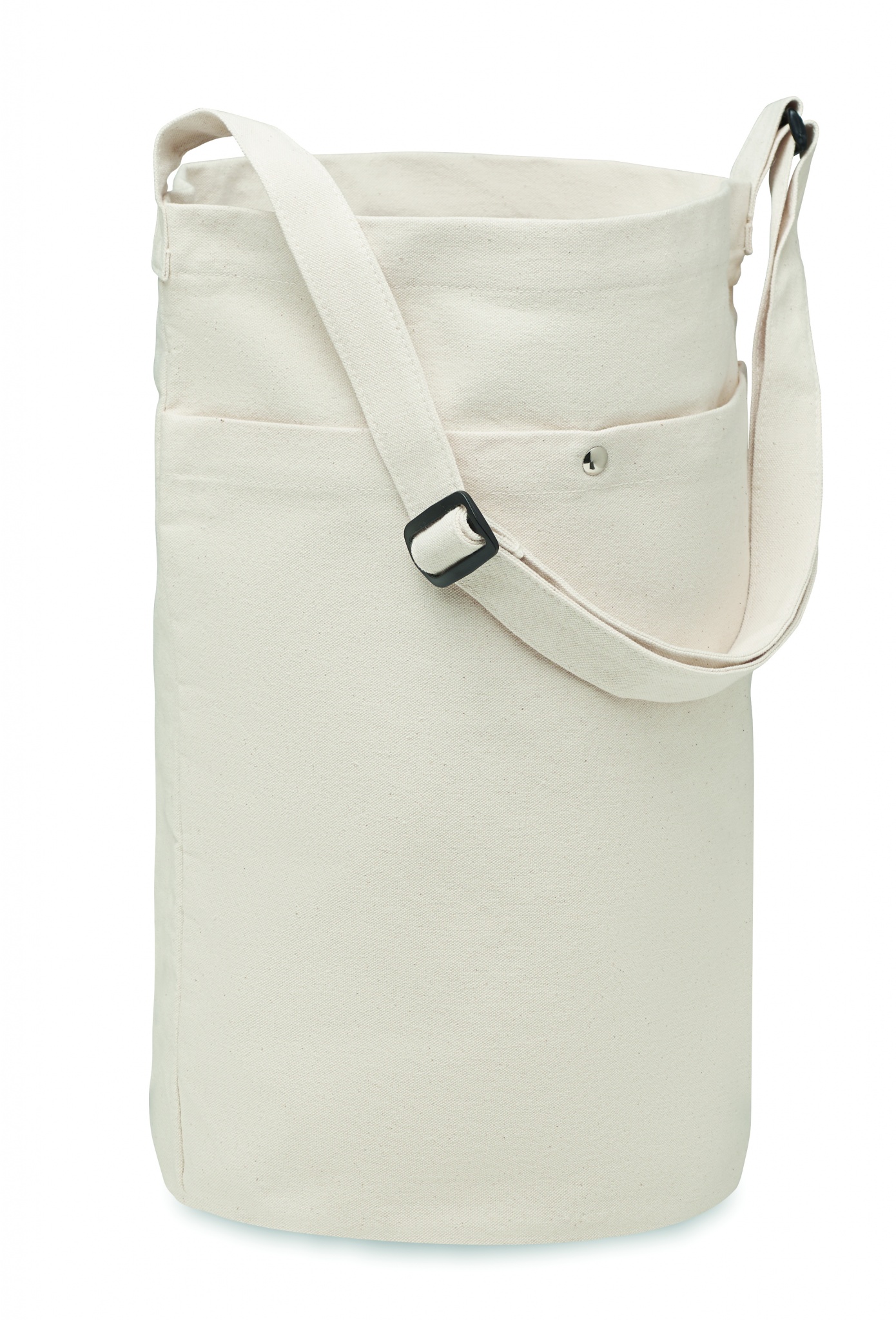 Kasse i naturfärgad canvas med lång justerbar axelrem och stor framficka med tryckknappstängning. Har innerficka. 270 gr/m².